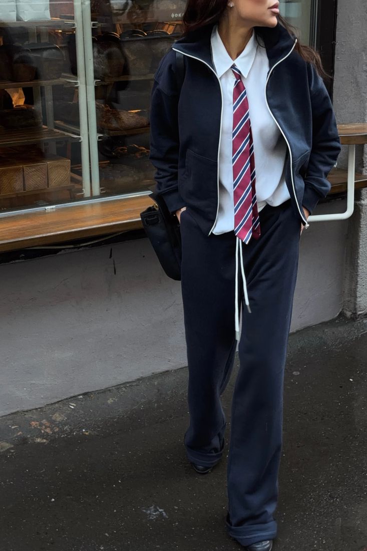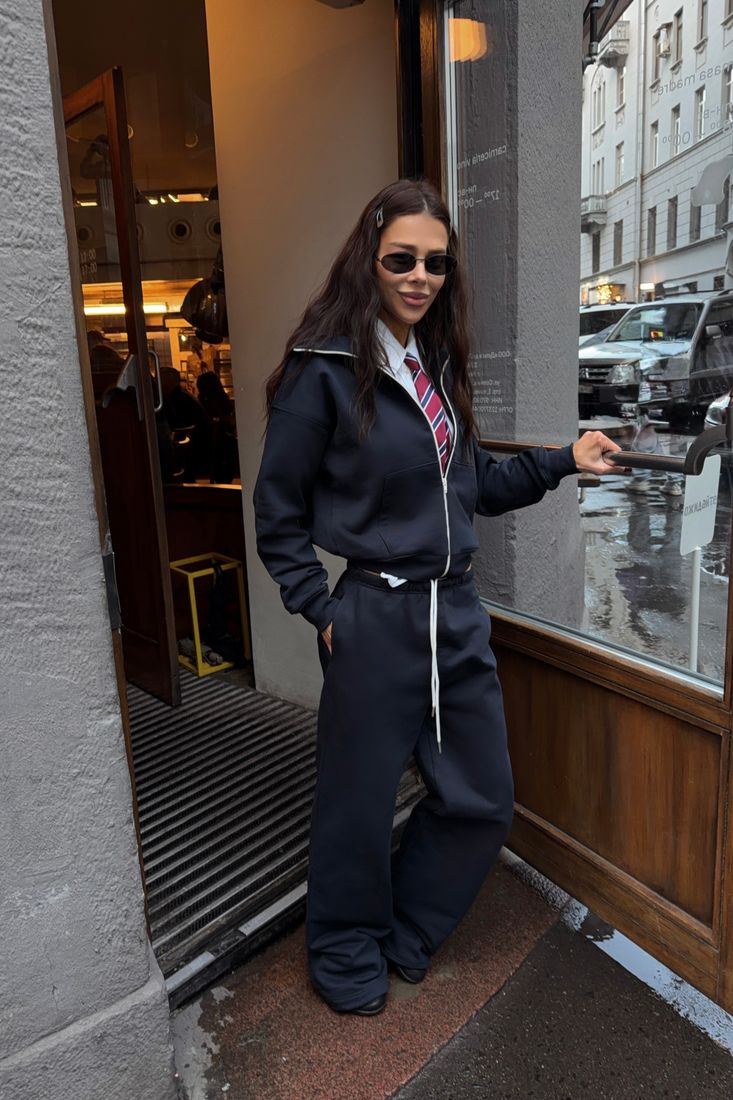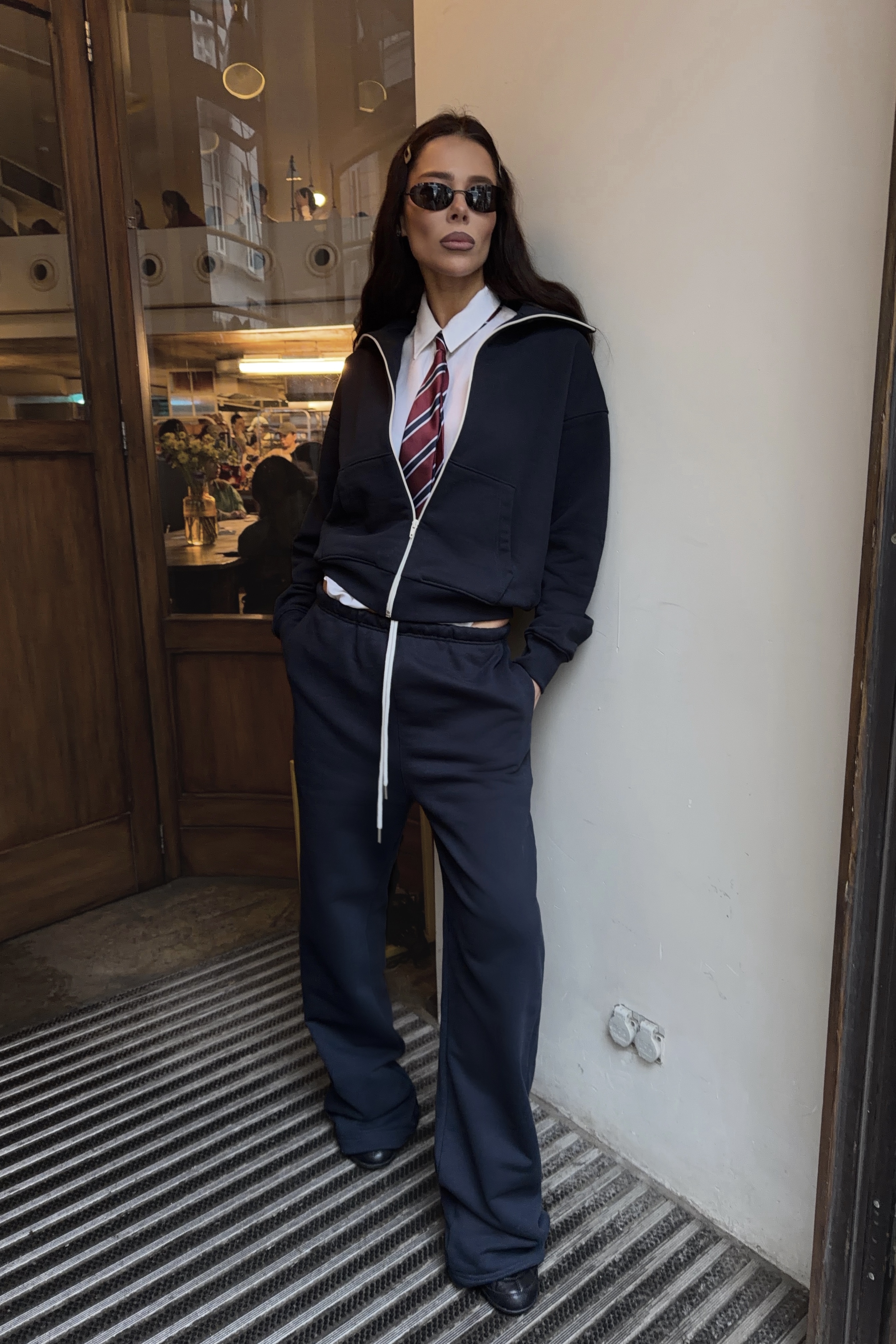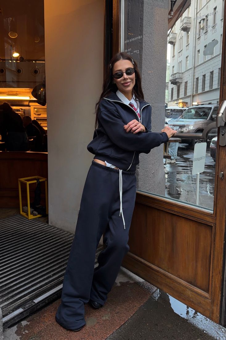 Носите брюки с олимпийкой и zip-худи в цвете navy blue или сочетайте с другими любимыми вещами.