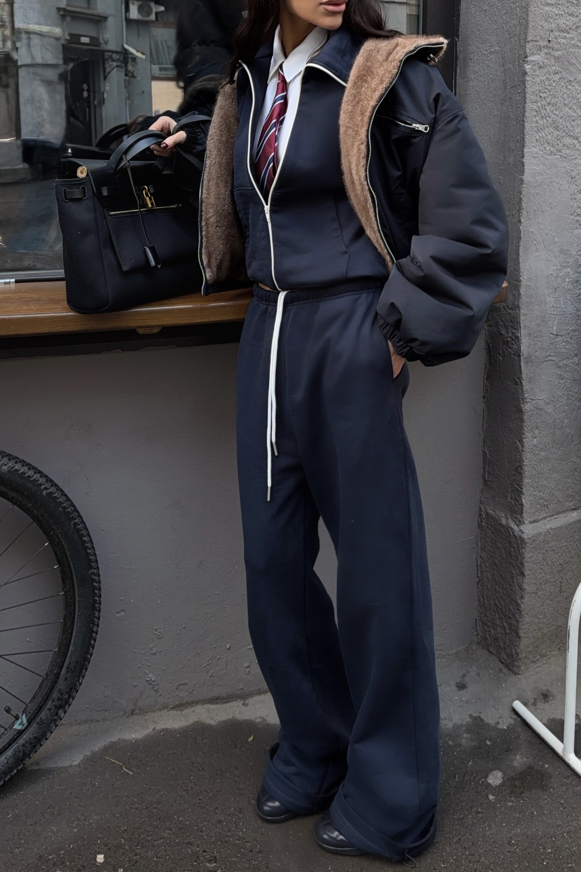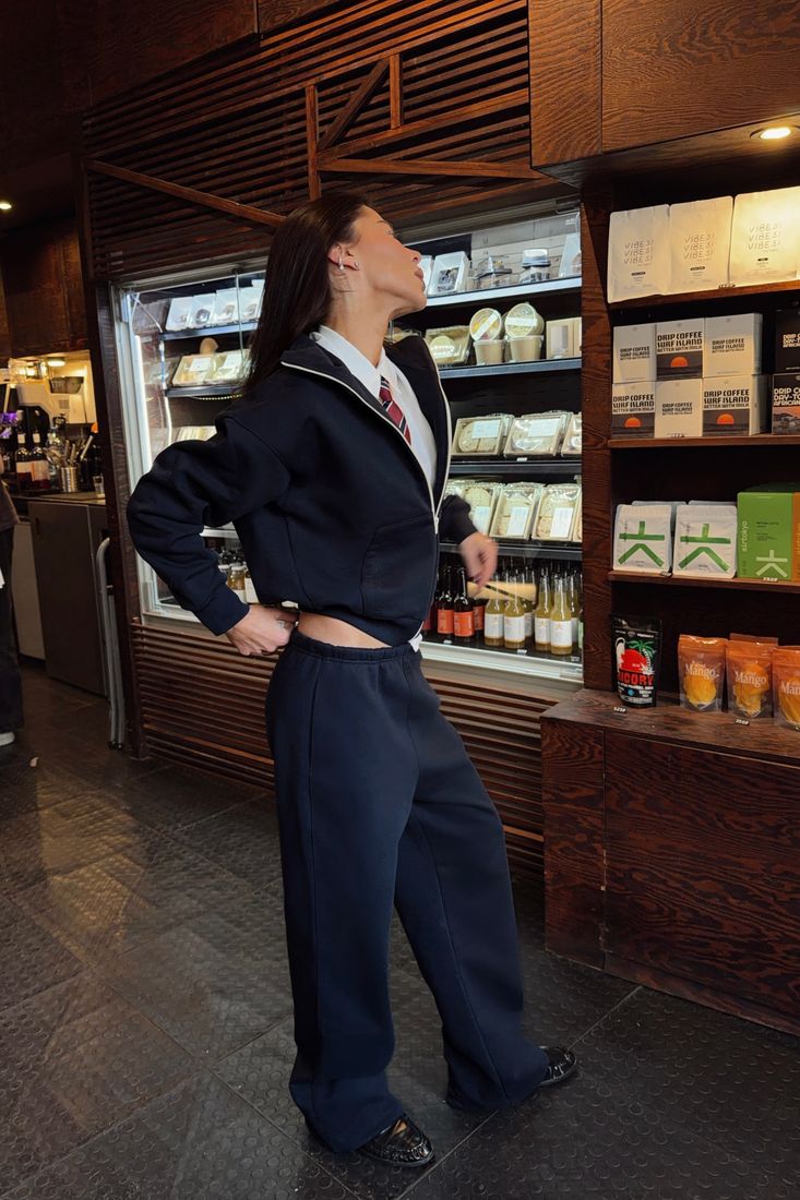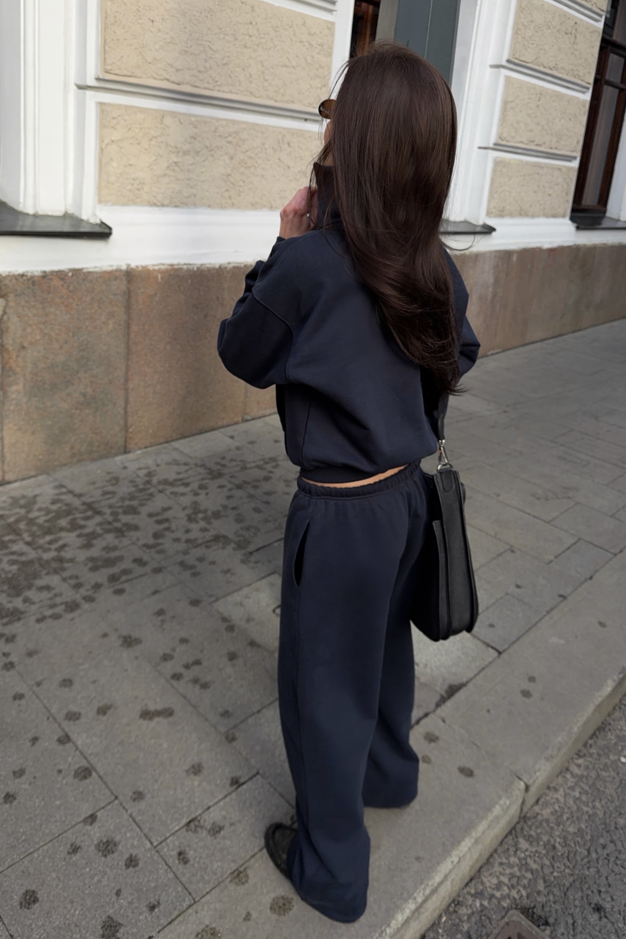 Носите брюки с олимпийкой и zip-худи в цвете navy blue или сочетайте с другими любимыми вещами.